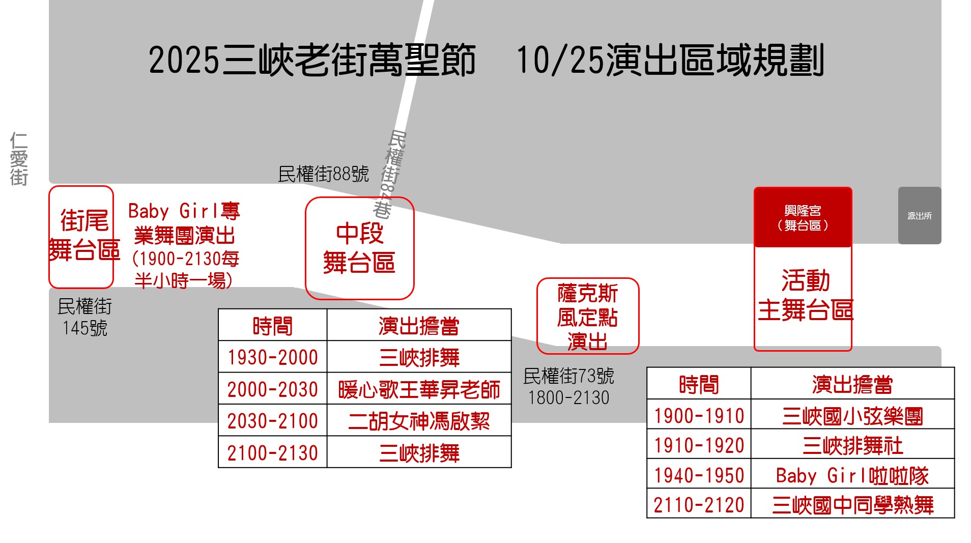 ►今年除了「興隆宮前廣場」設置主舞台有「精彩表演」及「萬聖節變裝比賽」之外,老街的中段及尾段也將架設舞台,包含「暖心歌王華昇老師」、「二胡女神 馮啟絜」、風靡南臺灣的「Baby Girl專業舞團」...等明星都會在這裡定點演出並與大家合照!