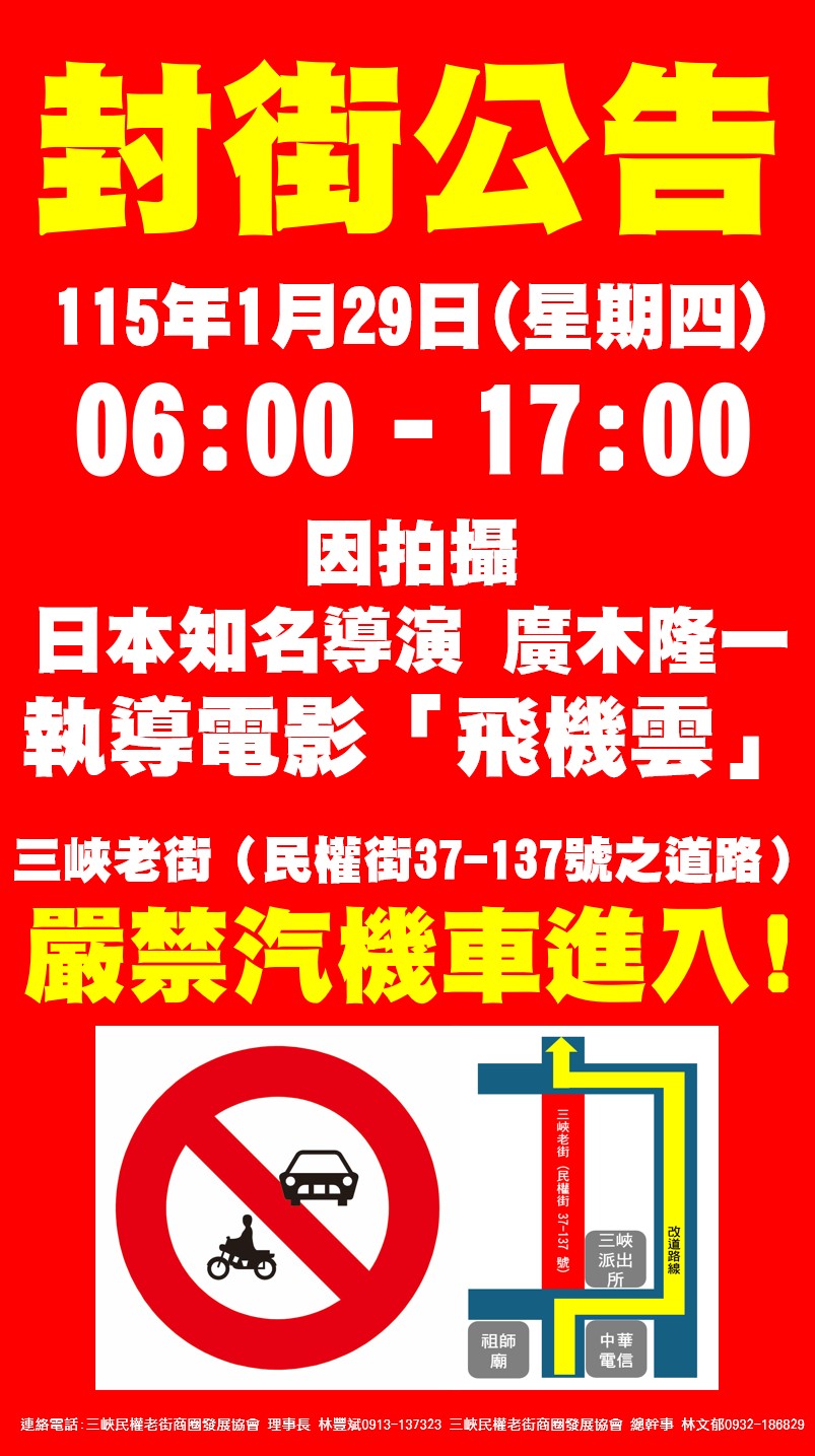 【封街公告】115年1月29日(星期四) 06:00–17:00,因拍攝「日本知名導演 廣木隆一」執導電影「飛機雲」,三峽老街(民權街37-137號之道路) 嚴禁汽機車進入 !