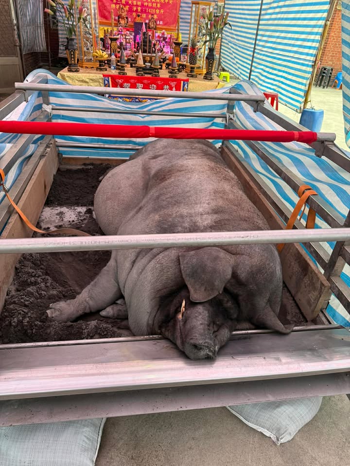 今年獲得「三峽祖師廟賽神豬-特等獎」的神豬,位在柑園,由詹官順先生所飼養,高達1426台斤...