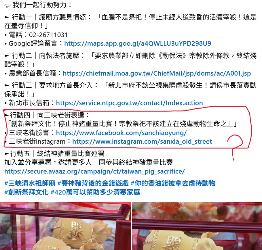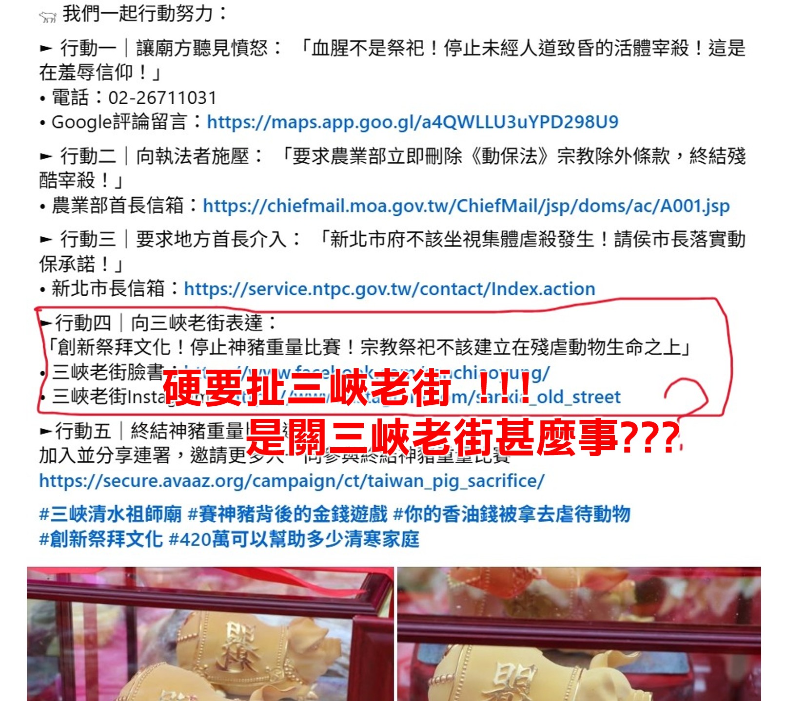 但「台灣動物社會研究會」2/24於FB發佈的【你的香油錢或善款,被拿去虐待動物了嗎?揭開三峽清水祖師廟賽神豬背後的「金錢遊戲」】文章內,卻無來由的把「三峽老街」列入文章中「行動四|向三峽老街表達:「創新祭拜文化!停止神豬重量比賽!宗教祭祀不該建立在殘虐動物生命之上」,企圖將「三峽老街」納入策動鼓吹網友留言反映的名單內…