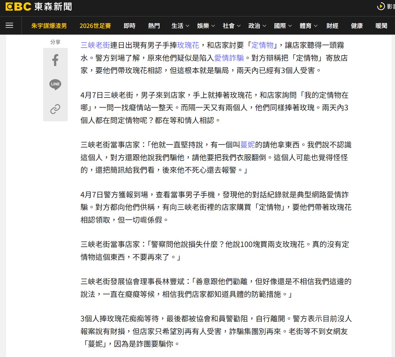 特別感謝 東森新聞 記者楊絜安 報導三峽老街「戀愛詐騙案」,提醒廣大民眾網路交友需特別注意,嚴防人財損失!
