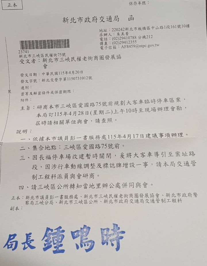 【建設未發,配套先行】特別感謝彭一書議員,積極協助「三峽老街」向新北市政府交通局爭取「大客車臨時上下客處」,使「長福停車場改建」對於三峽老街造成的影響減至最低